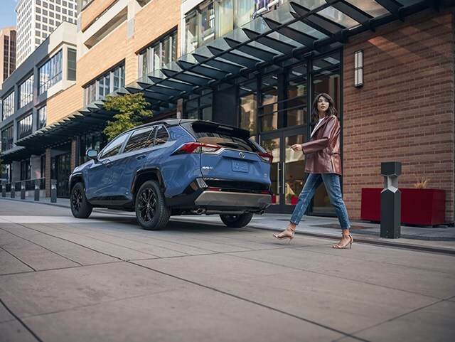 Blue Toyota RAV4 Hybrid XSE parked in front of a modern structure