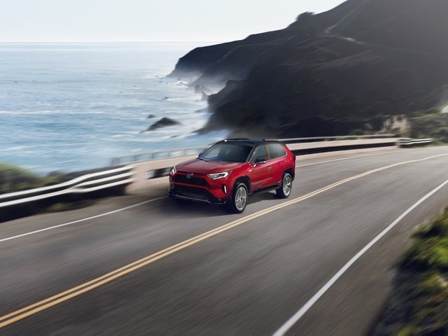 Blue Toyota RAV4 PHEV driving on the coast