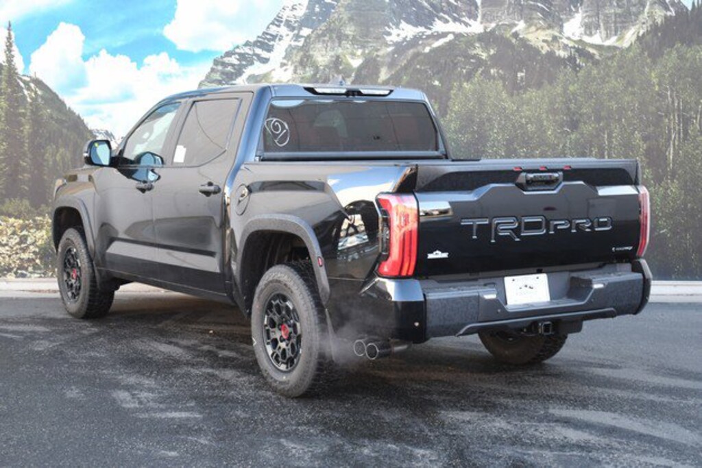 • 'TRD PRO' hood badge black door handles black window molding and mirror caps black technical-camo-grained tailgate spoiler and overfenders with marker lights