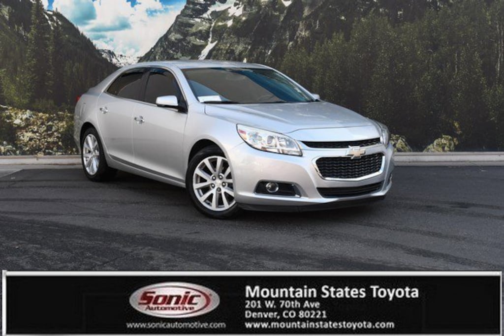 Check out this 2015 Chevrolet Malibu LTZ. Its Automatic transmission and Gas I4 2.5L/150 engine will keep you going. This Chevrolet Malibu features the following options: TRANSMISSION, 6-SPEED AUTOMATIC, ELECTRONICALLY-CONTROLLED with overdrive (STD), SILVER ICE METALLIC, SEATS, FRONT BUCKET (STD), PREFERRED EQUIPMENT GROUP includes Standard Equipment, JET BLACK, LEATHER-APPOINTED SEAT TRIM, ENGINE, ECOTEC 2.5L DOHC 4-CYLINDER DI with Variable Valve Timing (VVT) and intake Variable Valve Lift (iVVL) and NEW auto stop/start (196 hp [146.2 kW] @ 6300 rpm, 191 lb-ft of torque [257.9 N-m] 4400 rpm) (STD), Wipers, front intermittent with structureless wiper blades, Windows, power with Express-Down on all, Window, power, driver with Express-Up and Down, and Window trim, bright, side. See it for yourself at Mountain States Toyota, 201 W 70th Ave, Denver, CO 80221.