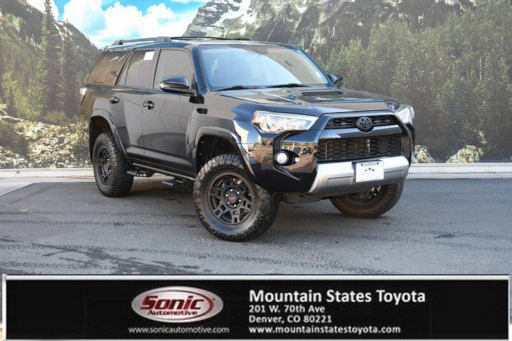 Come see this 2019 Toyota 4Runner SR5. Its Automatic transmission and Regular Unleaded V-6 4.0 L/241 engine will keep you going. This Toyota 4Runner has the following options: Wheels: 17 x 7.0 6-Spoke Alloy, Valet Function, Trip Computer, Transmission: Electronic 5-Speed Automatic w/OD, Transmission w/Sequential Shift Control and Oil Cooler, Trailer Wiring Harness, Tires: P265/70R17 Mud & Snow, Tailgate/Rear Door Lock Included w/Power Door Locks, Steel Spare Wheel, and Splash Guards. Stop by and visit us at Mountain States Toyota, 201 W 70th Ave, Denver, CO 80221.